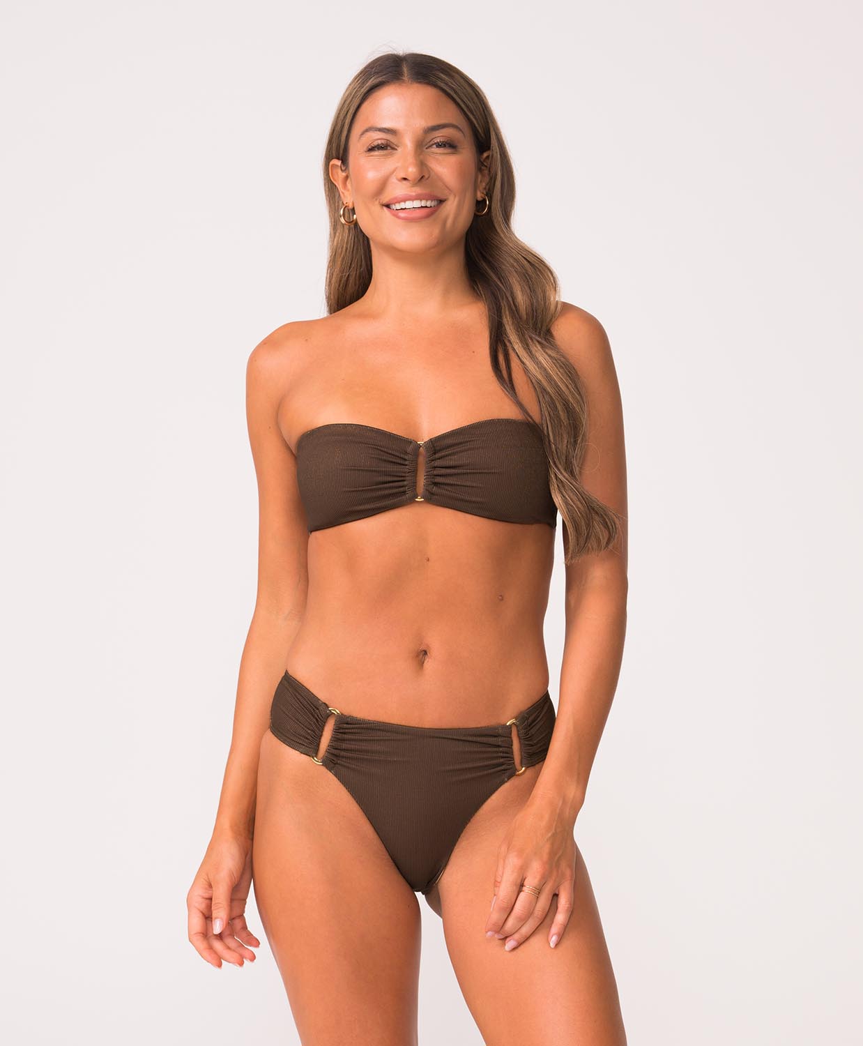 These high-waisted bikini bottoms offer the perfect blend of style and comfort. The sides are elegantly gathered and adorned with 24k gold-plated rings, adding a touch of luxury. With just the right amount of coverage, these bottoms create a flattering silhouette, ensuring confidence and comfort whether you’re by the pool or lounging on the beach.