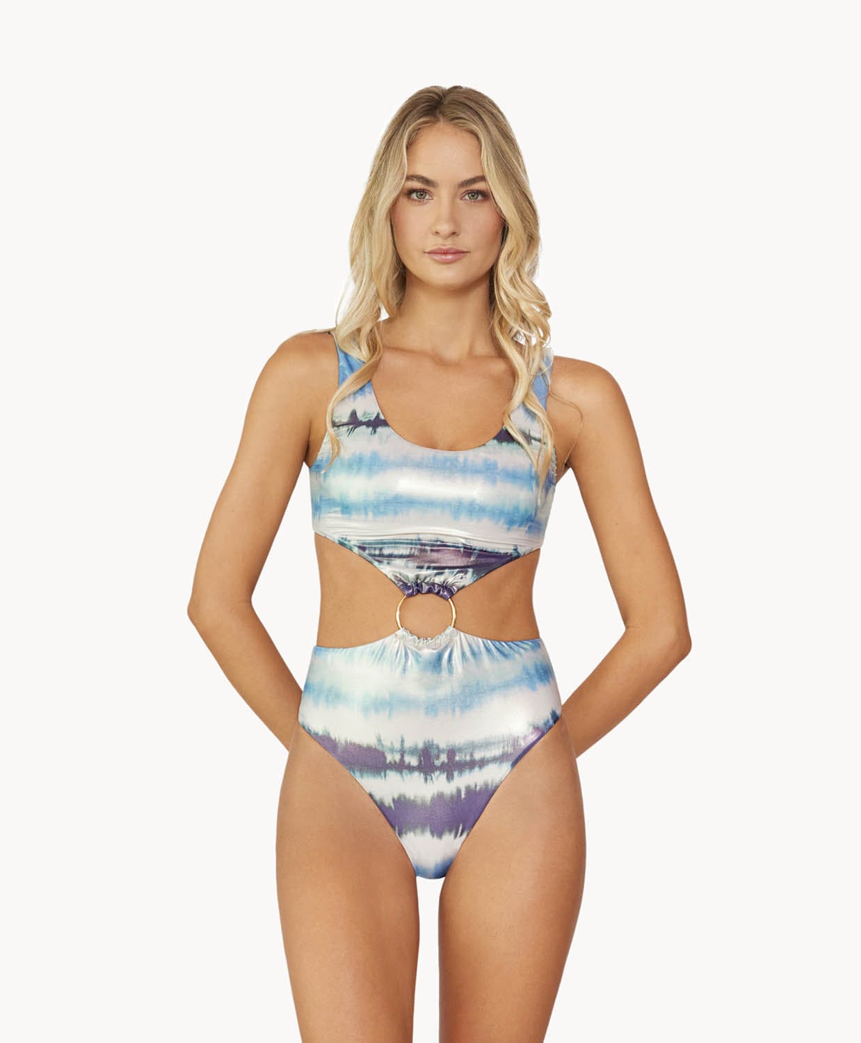 Embrace the sun in our Coastal Ring One-Piece, a stunning ensemble in shimmering metallic blue tie-dye. Its sleek cut-out silhouette, adorned with a 24k gold ring, offers a luxurious and sun-ready look. Perfect for those who love to combine glamour with comfort at the beach or pool.