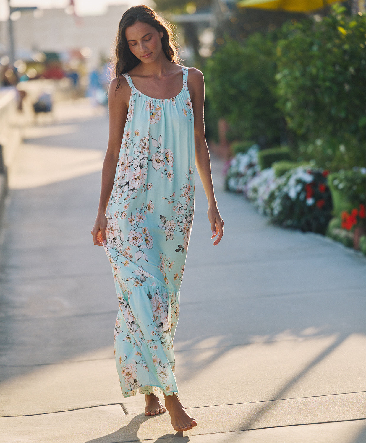 Embrace elegance with the Leilani Long Dress in a delicate Posie floral print. Featuring ribbon-style adjustable back straps for a custom fit and a breezy silhouette, this dress offers a soft, feminine touch that's perfect for any occasion.