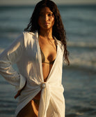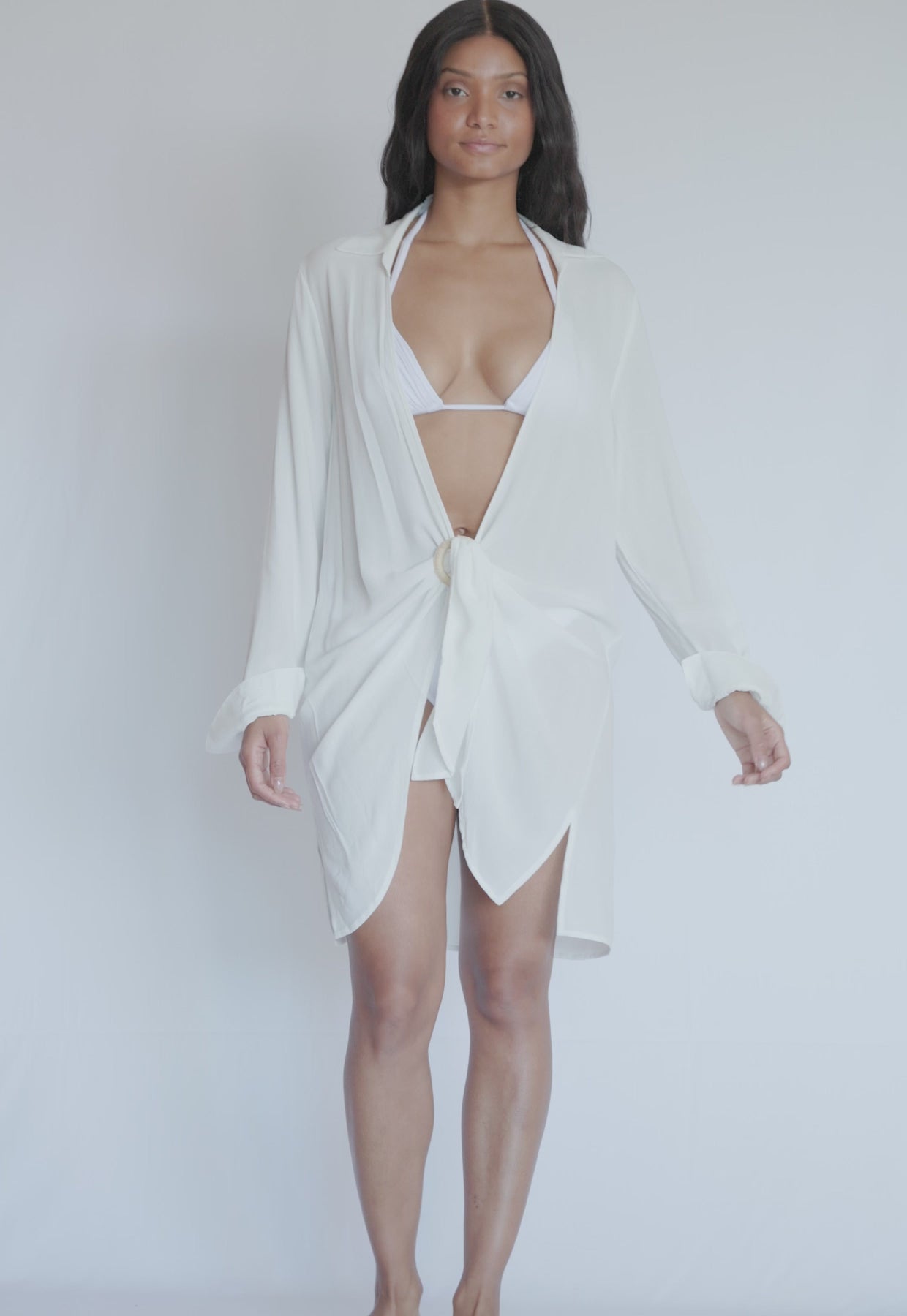 A classic menswear-inspired shirt reimagined. Our Millie Tie Cover-Up in a timeless white was made to throw over bare shoulders on sandy shoes. The convenient ring closure ensures it won’t catch too much wind.