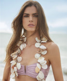 This bandeau features a wire-lined V slit and ruched front. Comes with removable straps & padding, and a tie closure in the back. Complete the set with the matching Violet Sands ruched tie bottoms