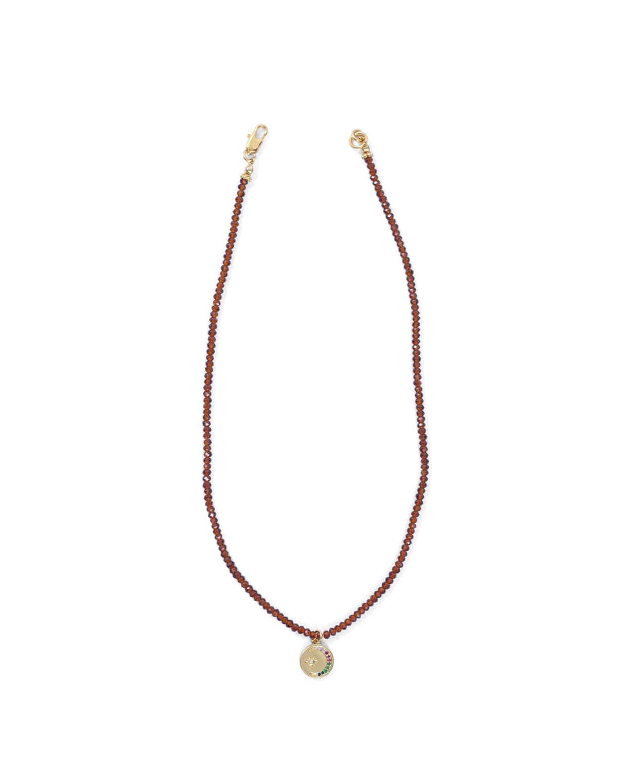 Beautiful hand-crafted choker with amber-colored beads and a gold celestial charm. Features a gold clasp for closure & is a great addition to your summer jewelry collection!