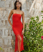 Our Vanessa strapless Fringe dress is sure to make a statement. It’s playful yet sophisticated and features a long flirty fringe hem. The exquisite macrame detailing is balanced by monochrome fabric and was designed for versatility whether you style it for a night out or impromptu day at the beach.