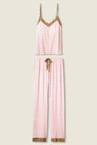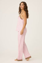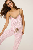 Prim with a pounce. This PJ set pairs dainty pink florals with bold leopard trim for a look that’s part coquette, part queen of the jungle. Crafted from silky-soft jersey with a flowy cami top and wide-leg pants, it’s equal parts sweet and statement-making. The adjustable straps and stretchy waistband make it an easy favorite for cozy nights or lazy mornings.