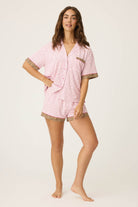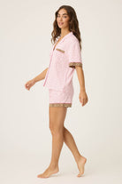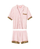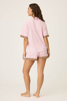 Prim with a pounce. This PJ set pairs dainty pink florals with bold leopard trim for a look that’s part coquette, part queen of the jungle. Crafted from silky-soft jersey with a relaxed button-down top and easy pull-on shorts, it’s equal parts sweet and statement-making. The notched collar and elastic waistband make it an easy favorite for cozy nights or lazy mornings.