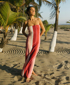 The Scarlett Jane Strapless Dress makes a statement with its vibrant pink, red, and white chevron pattern, woven with shimmering gold lurex for a subtle sparkle. Designed strapless and lined halfway up for comfortable, confident wear, it features a back slit that adds ease and movement—perfect for days that transition effortlessly from sunlit strolls to nights on the town.