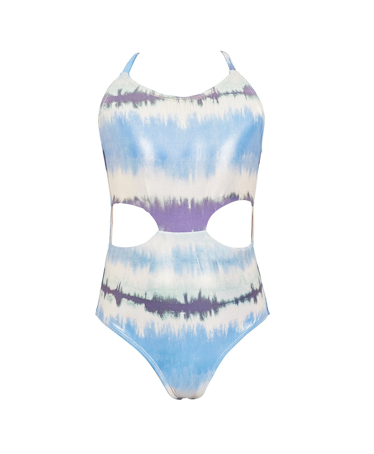 Our captivating little girl's one-piece swimsuit, features eye-catching shades of blue in a trendy tie-dye stripe print. This classic one-piece design is elevated with a chic side cut-out, adding a fashionable twist. The suit is complete with adjustable crisscross ties at the neck, ensuring a perfect fit and stylish flair.
