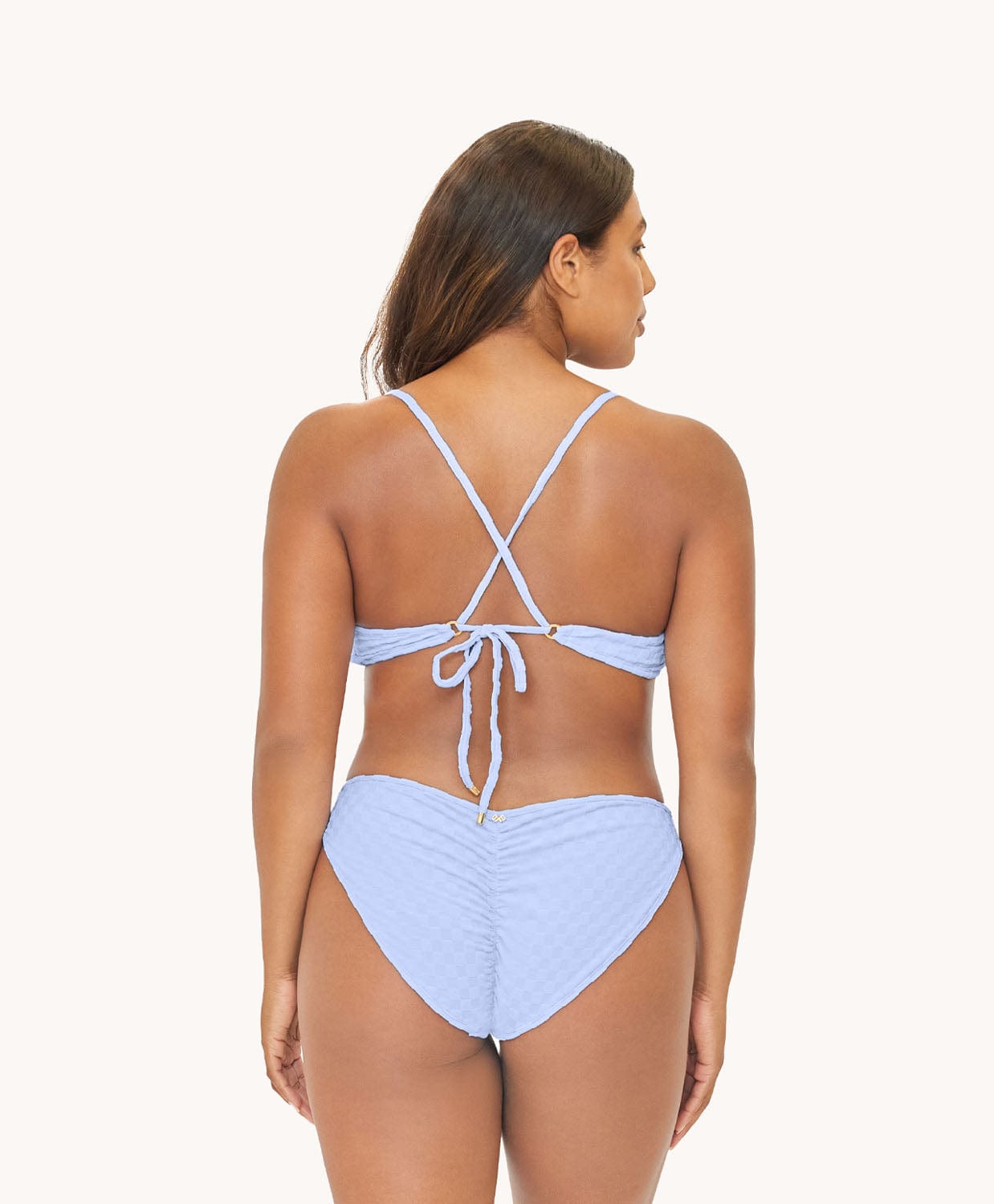 Step up your beach style with our Dockside Basic Ruched Bikini Bottoms, crafted from luxurious terry cloth material. Adorned with a trendy powder blue checkered pattern, these bottoms add a touch of sophistication to your swimwear. The timeless scoop bottom design, highlighted by self-piping and flattering ruching at the back, enhances your curves beautifully. Choose from a cheeky Brazilian cut or classic full coverage to suit your style.
