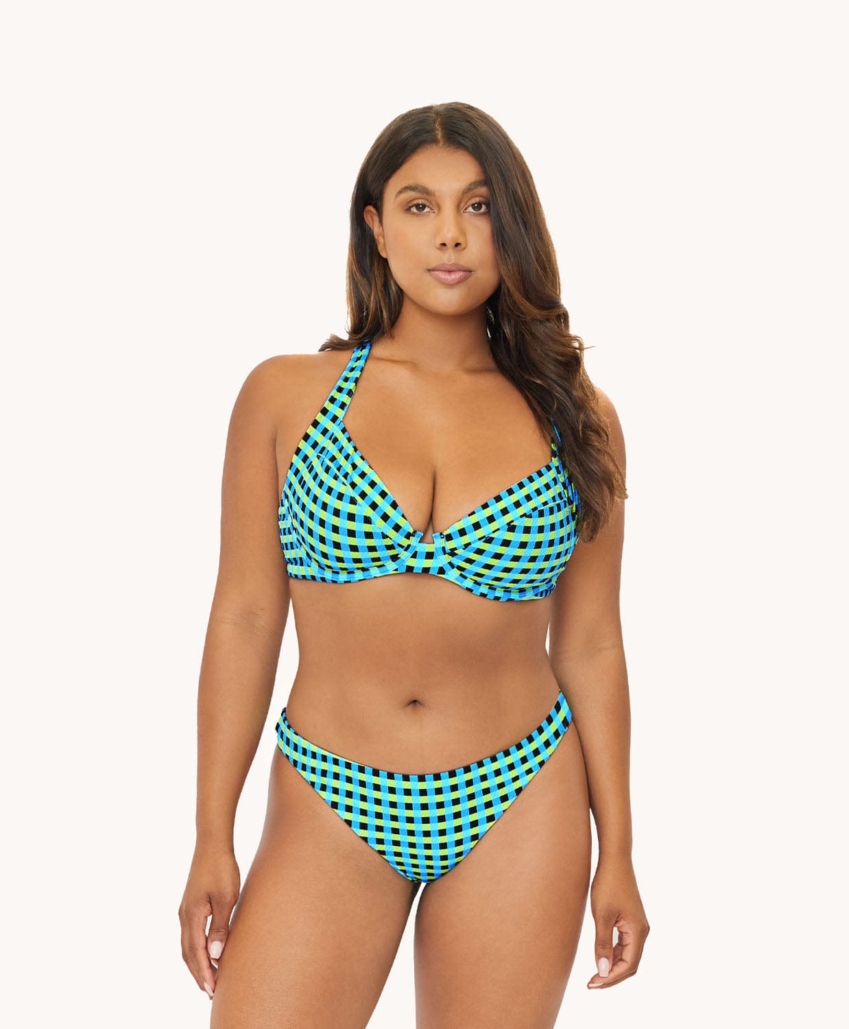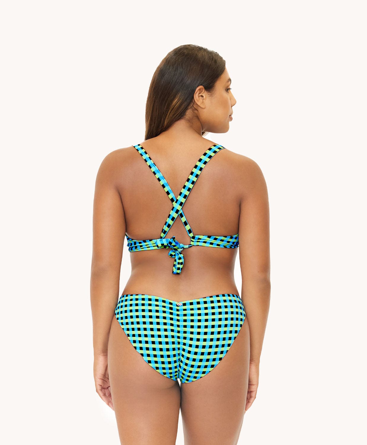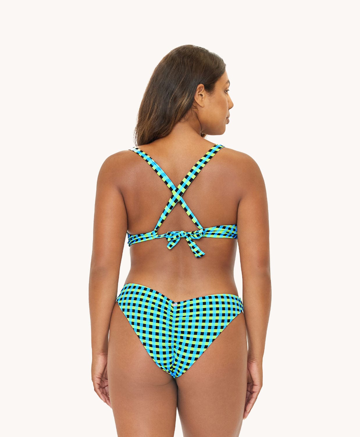 Enhance your beach style with our Gingham Drift Perla Underwire construction, Bikini, combining fashion and function. Featuring crisscross straps and a tie-back for support and fit, its neon gingham texture makes a bold statement.