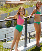 Get ready for some fun in the sun with our vibrant one-shoulder cutout one-piece for little girls! Inspired by the colorful creations of Solange Ferrarini, this swimsuit is a playful splash of color with its bold hot pink top and kelly green bottom. The rainbow elastic and embroidered thread detailing along the edges add an extra pop of whimsy, perfect for your little one's poolside adventures or beach day explorations.