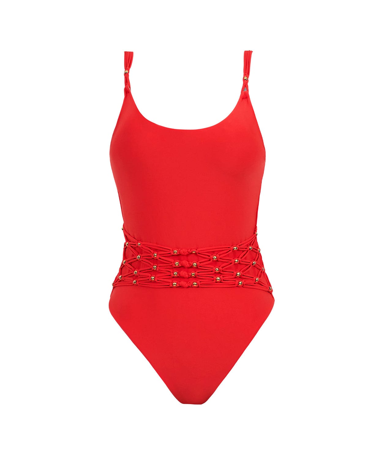 This elegant swimsuit features adjustable lingerie straps for a customized fit and maximum comfort. The standout feature of this piece is the overlay of net macramé, adding a unique and intricate detail at the waist. To add a touch of sophistication and luxury, the one piece is adorned with 24k gold-plated gold ball accessories.