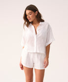 Effortlessly chic and versatile, the Water Lily Linen Top is a must-have for your wardrobe. Crafted from lightweight white linen, this top features a classic collar and buttons down the front, offering both comfort and style. Perfect for layering or wearing on its own, it pairs perfectly with our Water Lily Amira Linen Shorts for a coordinated, polished look.